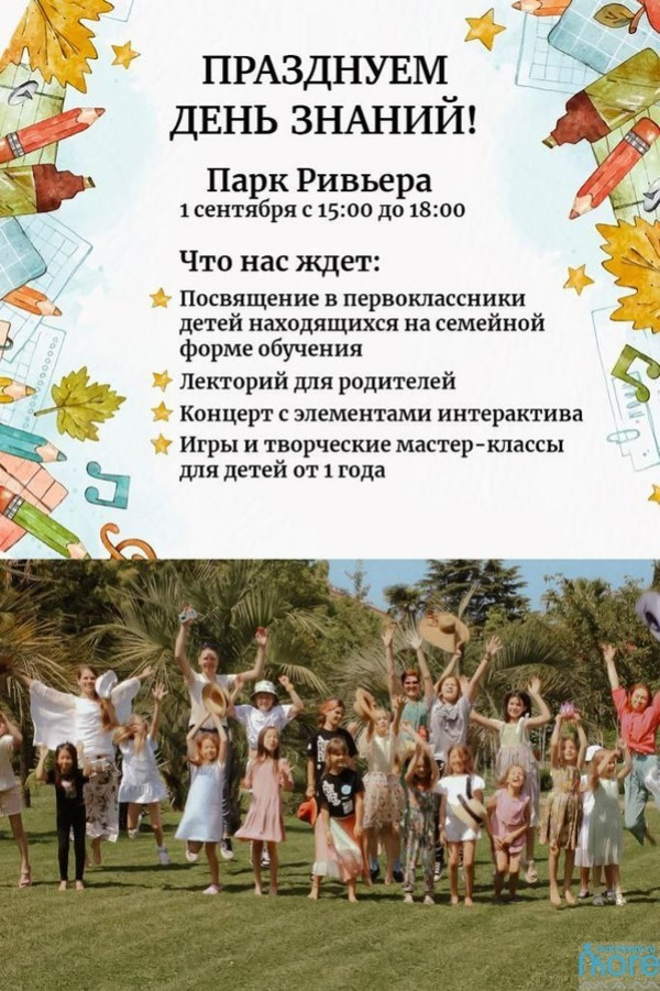 15:00 – 19:00 – день знаний в Ривьере. Мастер – классы, концертная программа. Арт-ярмарка